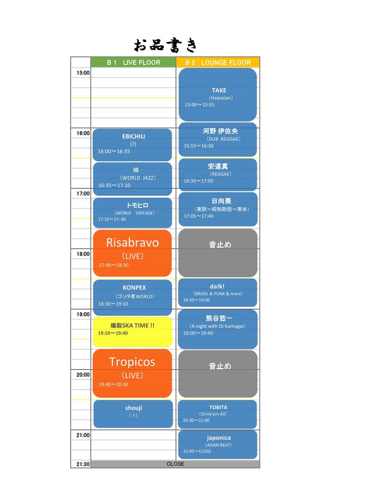 今回は「助っ人DJ」とFOODネタの紹介と、タイムテーブルの発表やで!!