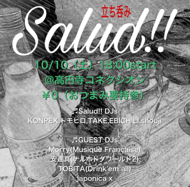 そんなメンバーでお送りする立ち飲みSalud!!は10月10日(土)18時開始です。